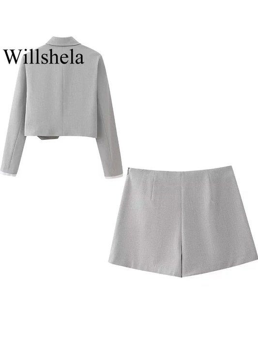 2 Piece Set Grey Single Breasted Lapel Neck Shirts & Vintage Side Zipper Skorts