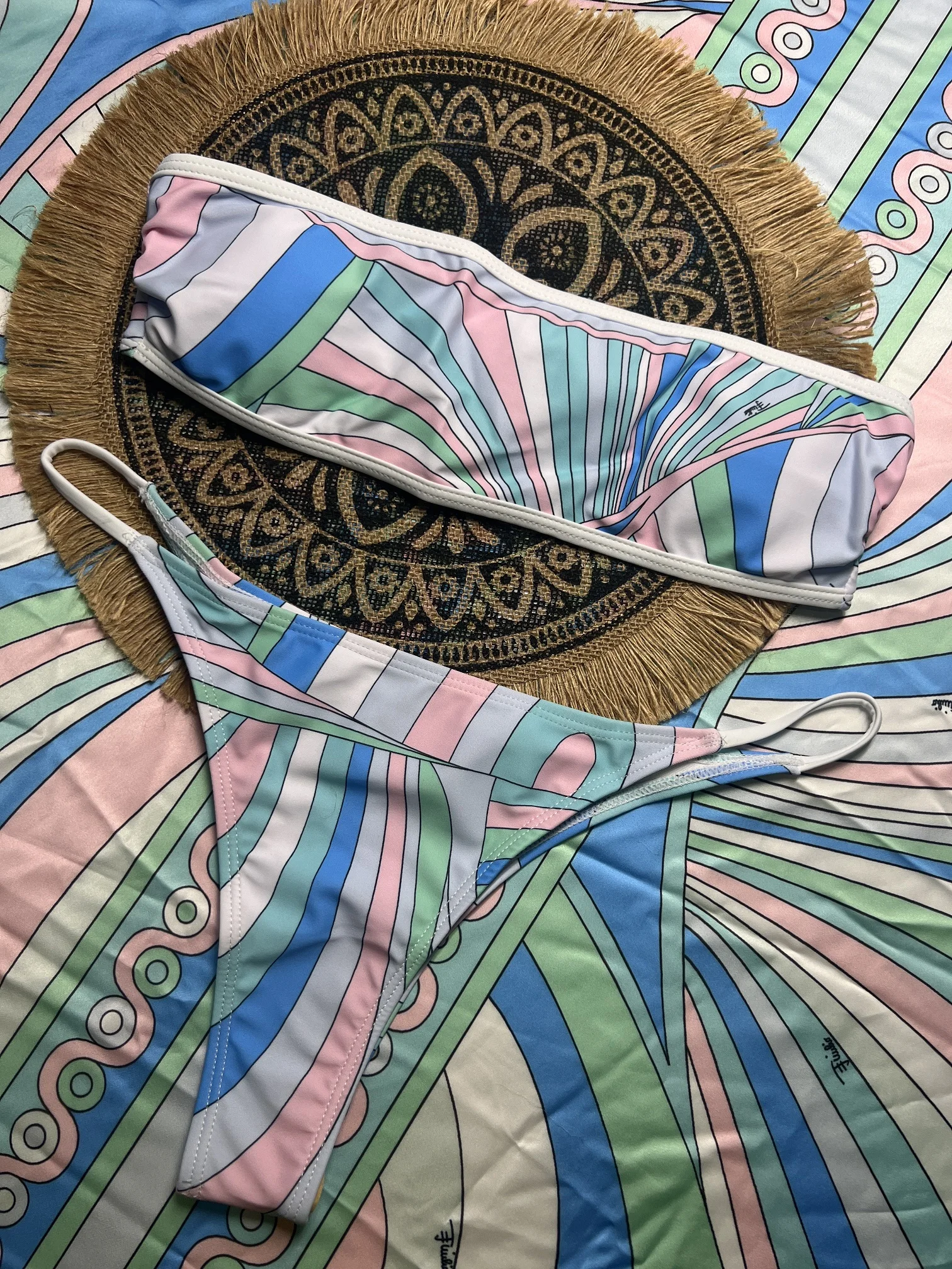 This three-piece swimsuit set for women is made of high-quality silk and polyester materials. The fabric is chemical-free and features a stylish combination of stripes and geometric patterns. The design is suitable for young women, with a wire-free and high-waisted style that is both fashionable and comfortable. It is crafted using the knitting technique and is available in a preppy style. This swimsuit has a recommended size that fits true to size for females.