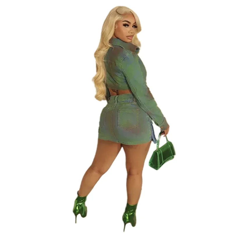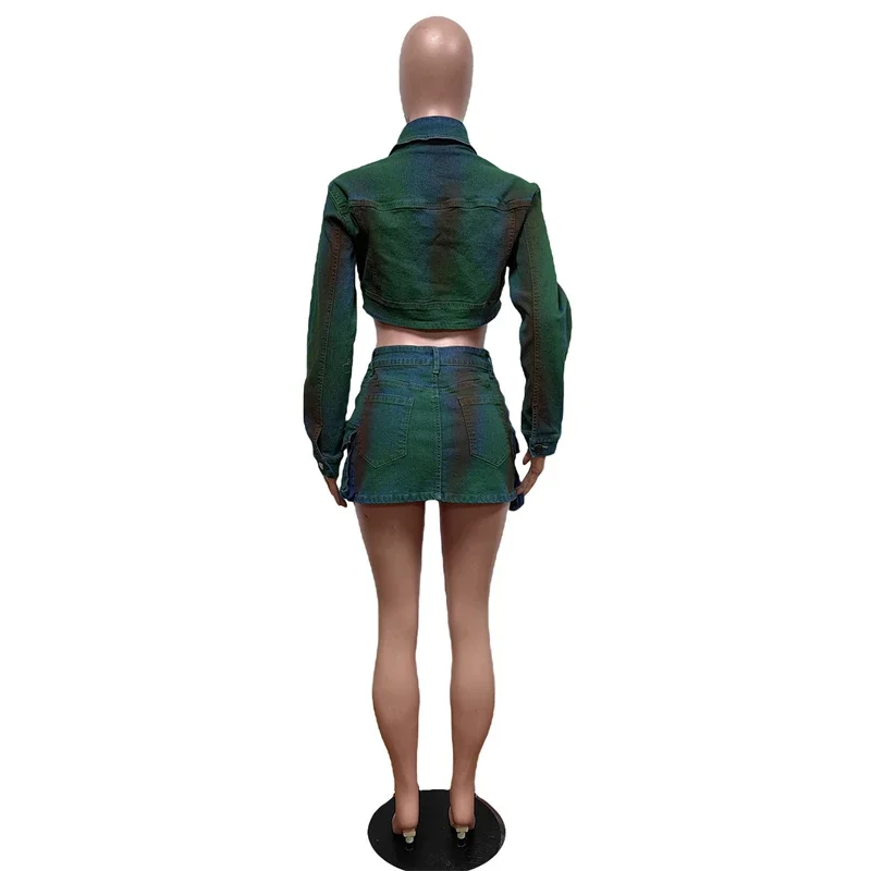 Expertly crafted for the modern woman, this Streetwear Denim 2 Piece Set is perfect for any summer outing. The set features a trendy crop top and stylish skirt, both made from high-quality denim fabric. The mix of COTTON, SPANDEX, and POLYESTER materials offer both comfort and durability, making it an essential addition to your wardrobe. This set is produced in Mainland China, specifically Guangdong, and has a fabric content of 71% to 80%. With functional pockets, a turn-down collar, and a single-breasted closure, this set combines practicality with fashion. The sleeves are regular in style and the material composition is made of synthetic fiber. Featuring a solid color pattern, it is suitable for any occasion and designed specifically for women. The dress silhouette is a flattering sheath and the pant has a zipper fly closure. With a full sleeve length and a mini length for the skirt, this set exudes sophistication and elegance. Order now and
