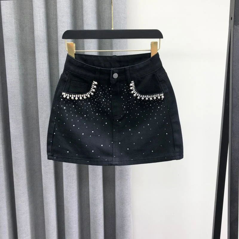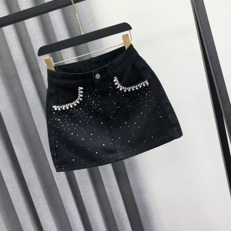 This denim skirt for women in 2024 is made of cotton and polyester, providing slight stretch for a comfortable fit. It features a high waisted A-line design and hip wrap trend, making it perfect for all seasons. The fabric type is broadcloth and it has an empire waistline with a solid pattern. The fit is regular and the silhouette is A-line, with a length that falls above the knee, making it suitable for all women.
