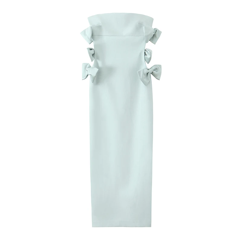 This dress features a mid-calf length and slim fit, along with a strapless neckline and regular sleeve style. Made from a slight stretch polyester fabric, this A-line silhouette dress includes a zipper closure and bow decoration. Perfect for summer, it is a high street fashion choice and includes a solid pattern. Crafted with TAT material and a natural waistline, it will be released in summer 2024 without any concerns for chemical content.